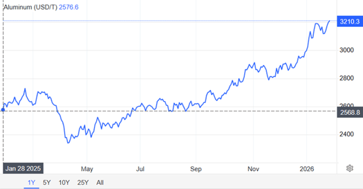 Aluminium prices have continued to rise over the past year, increasing from USD 2,569 per tonne in January 2025 to USD 3,210 per tonne in January 2026. This marks a 25% year‑on‑year increase, underscoring a market that has tightened considerably.